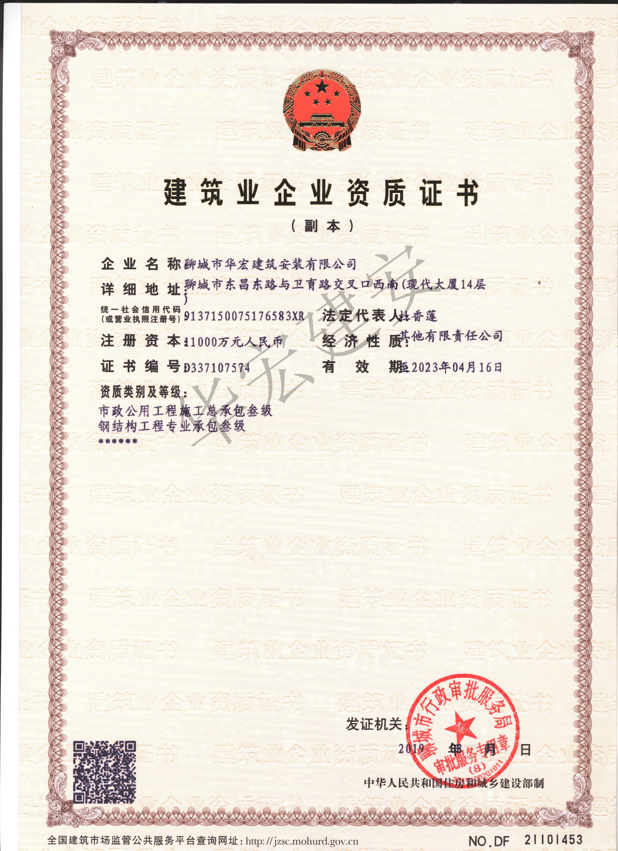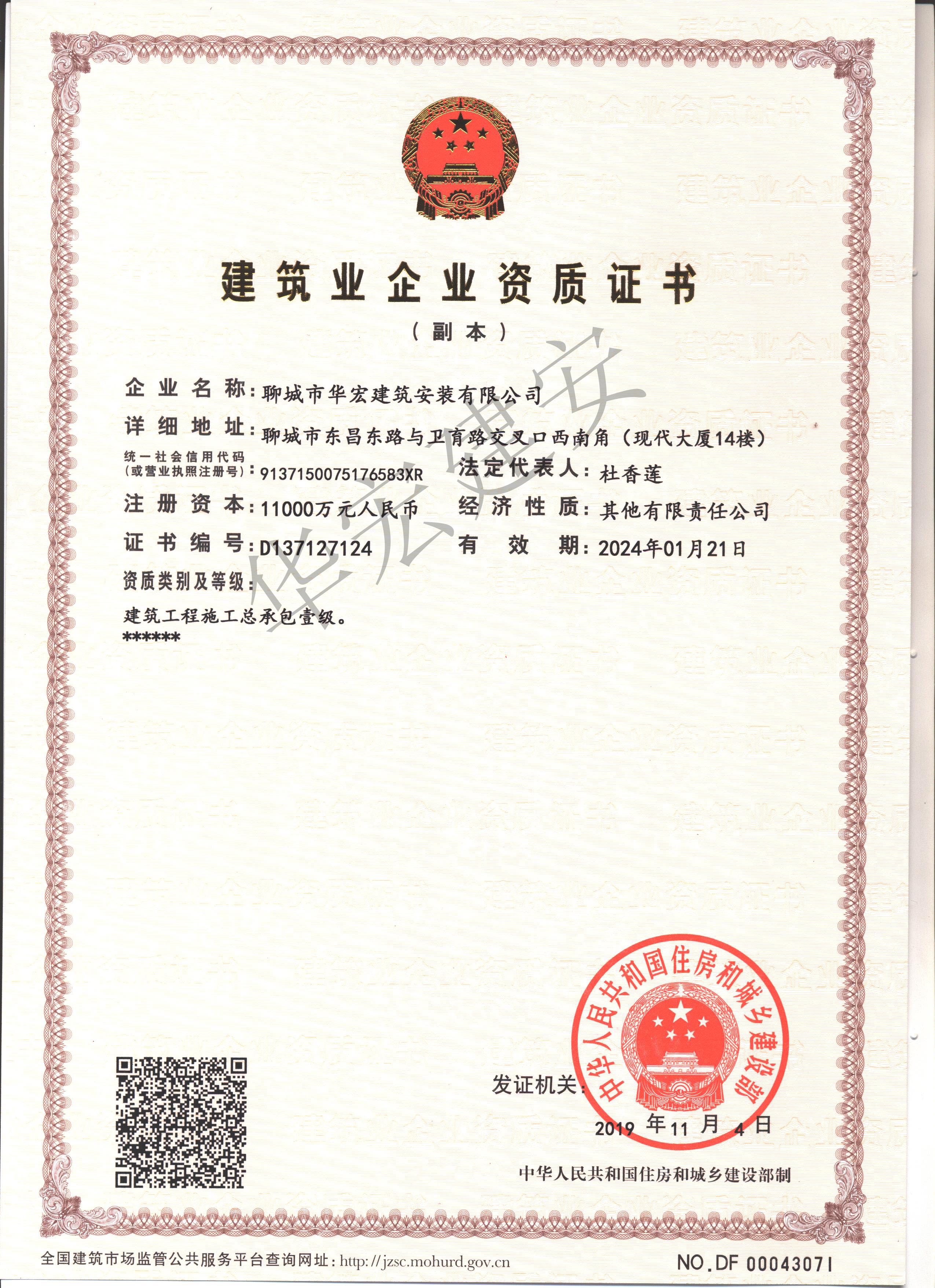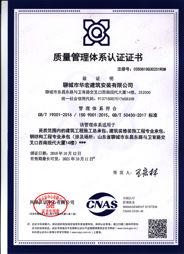 聊城市華宏建筑安裝有限公司成立于2002年5月,公司自2002年成立以來(lái),不斷發(fā)揚(yáng) “敬業(yè)修身 打造精品 開(kāi)拓創(chuàng)新 弄潮勇進(jìn)”的創(chuàng)業(yè)精神,始終遵循“以質(zhì)量求生存、靠精品創(chuàng)品牌、憑信譽(yù)贏市場(chǎng)”的宗旨,認(rèn)真奉行“科學(xué) 高效 一流”的質(zhì)量方針